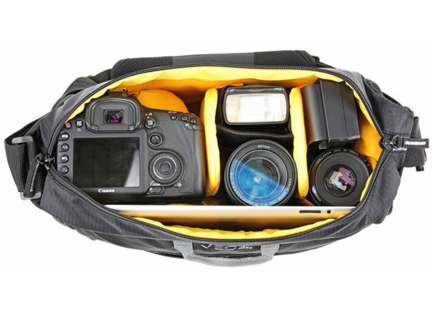 Capaciteit voor een DSLR-camera met één geïnstalleerde lens, 1-2 extra lenzen en een flitser Ruimte ook voor een tablet tot 11" Het interieur van de Veo Discover 38 tas is volledig gewatteerd Met de riemen aan de buitenkant bevestig je een statief Het geeft snel toegang tot je spullen bovenop Inclusief waterdichte hoes Een gewatteerde schouderriem voor comfortabel dragen Naast de fotoapparatuur kun je in deze tas een 11" tablet kwijt. Dit kan op een gegeven moment erg handig zijn, als je een foto op een groter scherm wilt bekijken of als je snel wilt overgaan tot een aanraking. Je kunt ook een statief bevestigen met de riemen aan de buitenkant, zodat je alle spullen in één tas hebt.