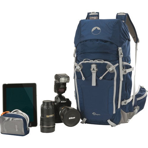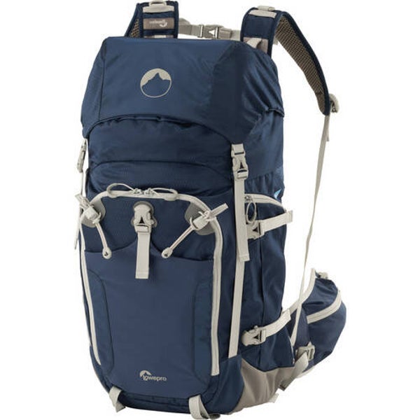 De galaxy blauw met grijze afwerking Rover Pro 35L AW rugzak van Lowepro is iets kleiner dan de 45L versie, maar blijft een serieuze rugzak voor de outdoor liefhebber. Met zijn vele mogelijkheden en capaciteit kan deze rugzak je meer dan door een dag in het veld of een nachtelijke wandeling of beklimming loodsen. Zijn uitrusting is aanzienlijk. De Rover is geschikt voor uw professionele DSLR met handvat en 24-70mm f/2.8, een extra lens of flitser plus een statief of monopod. Er is zelfs ruimte voor uw slaapmatje, kleine tent, ijsbijl of trekkingstokken plus extra persoonlijke spullen.
