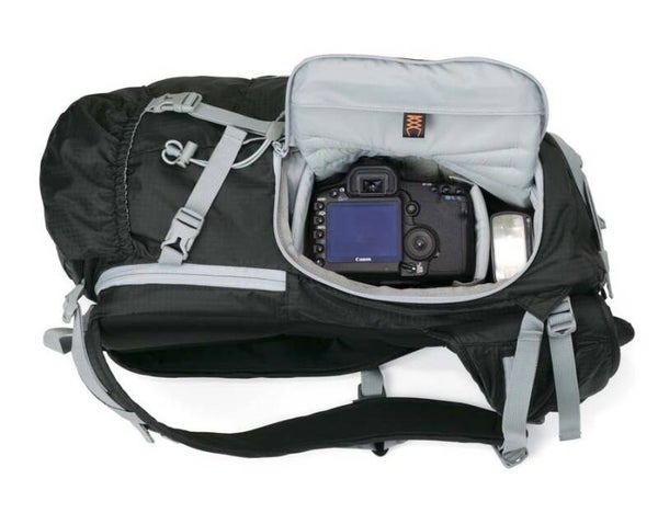 Het gevoerde en veilige fotovak biedt voldoende volume voor een professionele spiegelreflexcamera, een zoomlens en een extra flitser. Het bovenste compartiment is ideaal om een jas, waterfles of andere persoonlijke spullen in mee te nemen.