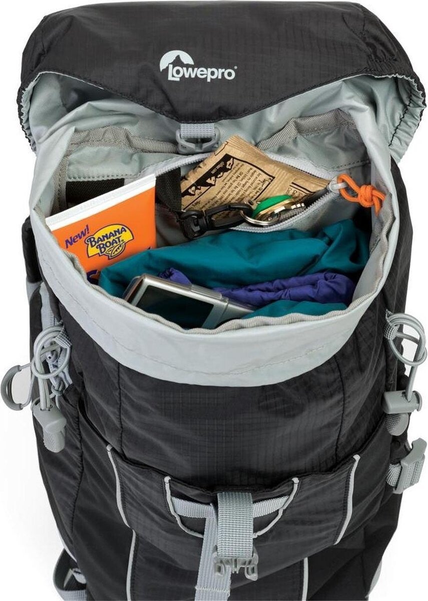 Ook niet onbelangrijk is de snelle zijingang naar het camera compartiment zodat je geen foto meer hoeft te missen. Verder is er ruimte voor een waterzak (niet inbegrepen), maar deze ruimte kan ook gebruikt worden om een compacte notebook of iPad mee te nemen. Andere kwaliteiten zijn verder: reflecterende belijning, een gegoten anti-transpirant achterwand voor optimale ademing, meerdere compressieriemen en een AW-hoes.